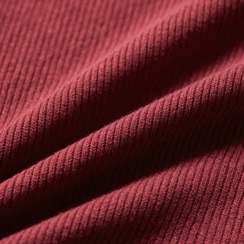 1*1 Ribbed Velvet Fabric är ett tyg som använder 1 nål upp 1 nål ner vävprocess, och ytan är täckt med fin sammet (fin sammet), som har utmärkt värmebevarande och mjuk touch. Dess räfflade vävstruktur gör tyget mycket elastiskt, kan sitta tätt mot huden och ger en bekväm bärupplevelse, speciellt lämplig för användning under kalla årstider. Tygets sammetsyta är inte bara mjuk och ömtålig utan ökar också komforten och kan effektivt låsa in värmen och förhindra att kall luft kommer in. Detta tyg har stark värmebevarande och är lämpligt för vinterkläder, speciellt tröjakragar och leggings midjeband, vilket ger extra värme och stöd för dessa delar. Dess 1*1 ribbdesign ger tyget bättre elasticitet, vilket gör att tyget kan expandera och dra ihop sig fritt, vilket säkerställer passform och komfort när det bärs.